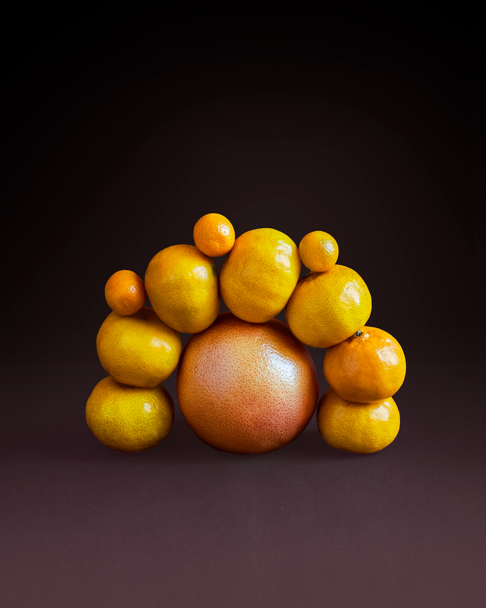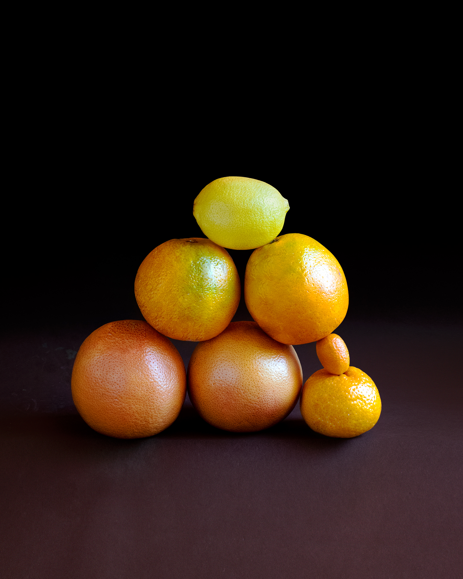 Winter is citrus season. This shoot aims to highlight all the colours and shapes of citrus varieties. The fruit includes both home grown and supermarket produce. The round forms were difficult to stack and build taller scuptures.