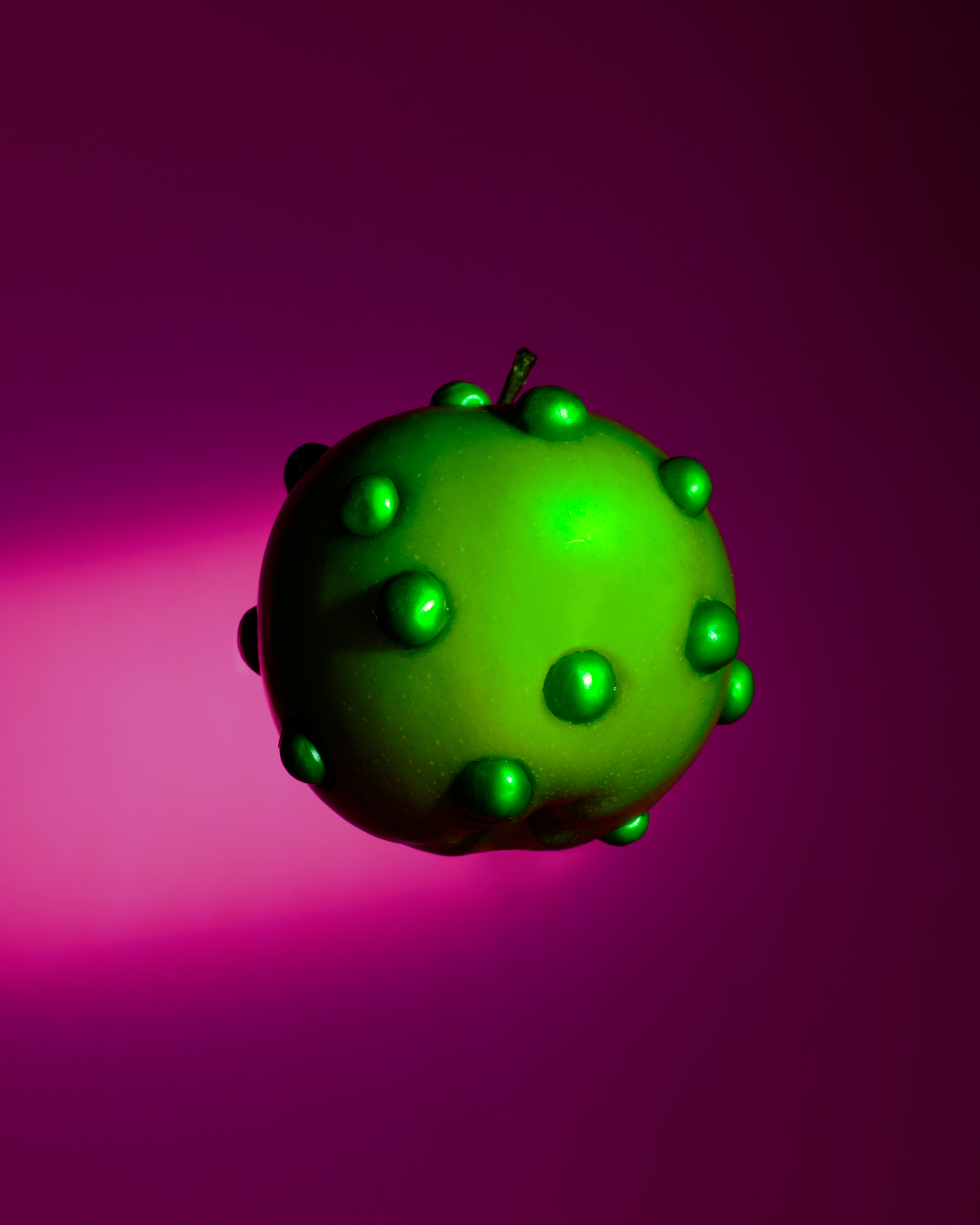 This idea of placing peas on the surface of an apple came to me in a dream. I like how the final form remains ambiguous; is it a pimply apple, virus cell, or meteor?